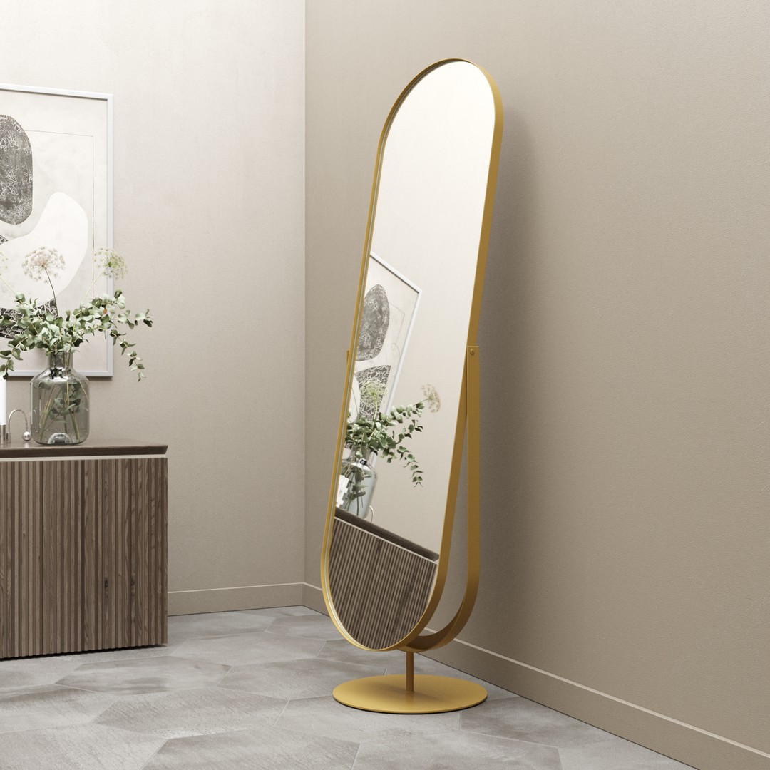 Зеркало «Queen». Артикул GMZ-01-1/2/3 Дизайнерское напольное зеркало в полный рост в металлической овальной раме ручной работы выполнено в минималистичном стиле. Простая изысканность форм и современный дизайн делает его уместным практически в любом интерьере. Оно может быть установлено в спальне, прихожей, гостиной, где за счёт своих внушительных размеров способно расширить пространство и создать иллюзию источника освещения. Зеркальное полотно изготовлено известным бельгийским производителем AGC и воплощает в себе старинные европейские традиции в совокупности с новейшими технологиями изготовления стекла. Наклон зеркала оптимальный фиксированный, что позволяет отражать любой рост.Характеристики:– профиль рамы – труба, диаметром 20 мм; – габариты – 1650х540х400 мм; – размер зеркального полотна – 1350х500 мм, толщина – 4 мм; – вес – 11 кг; – устойчивая двухслойная порошковая окраска; – возможные цвета – золотой, чёрный, белый.